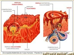 Existem basicamente três tipos de papilas: filiformes (parecem com “pelos”), que “sentem” temperaturas; caliciformes (parecem com “cálices” em corte longitudinal), que “sentem” um pouco os sabores; e as fungiformes (parecem “bolotinhas”, mais claras e muito menores que as caliciformes), que “sentem” muito os sabores.