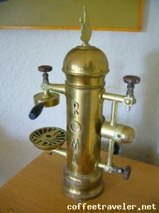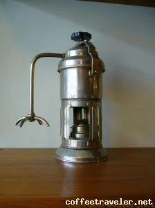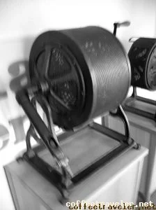 Torrador manual, porém com aquecimento através do eixo central. É uma belíssima peça!