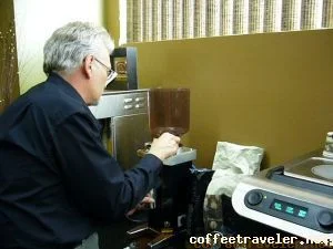 Nesta foto ao lado tem-se o momento em que a água é vertida sobre o café moído. E aqui um detalhe interessante: o controle de temperatura da água é tão rigoroso que a variação não ultrapassa 0,5°C.
