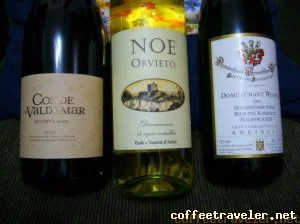 Para que pares perfeitos pudessem ser formados, Manoel selecionou os três vinhos que estão nesta foto a partir do esplêndido catálogo da Mistral Importadora: um espanhol Conde de Valdemar, Rioja de 2002; o italiano Noe, Orvieto; e o alemão Domdechant Hoccheimer, de 2005.