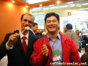 Nesta foto, estamos juntos, Manoel Beato, com sua colher de prata para provar café, e eu, seu Coffee Traveler.