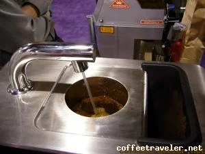 Nesta foto ao lado tem-se o momento em que a água é vertida sobre o café moído. E aqui um detalhe interessante: o controle de temperatura da água é tão rigoroso que a variação não ultrapassa 0,5°C.